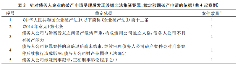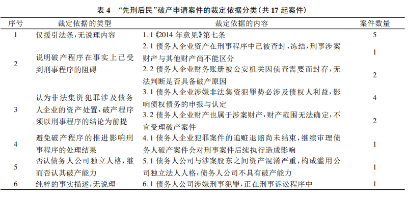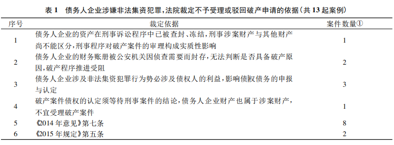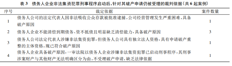 立”的破产申请案件中,有一半的法院对债务人企业涉及的非法集资犯罪对破产申请的影响加以分析之后,仍然选择受理破产申请。表3中的第4项裁定依据认为,以债务人企业涉嫌非法集资犯罪已启动刑事程序,其刑事涉案财产与其他财产无法明确区分为由不受理破产申请,缺乏法律依据,与“先刑后民”破产申请案件中法院援引《2014年意见》第七条的做法针锋相对。剩余的3起案件的法院仅是以常规的债务人企业具备破产原因为由裁定受理破产申请,对债务人企业涉及刑事犯罪程序未加评论。