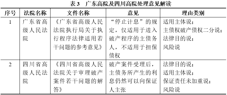 对于表2中第4项裁判理由,笔者认为在主债务人未破产的情况下,保证人承担保证责任(包括清偿前的利息)后,有权向债务人追偿。而在主债务人破产的情况下,保证人在破产程序终结前已承担保证责任的,其向债务人的求偿权以债权人已申报债权在破产程序中应得清偿部分为限。债权人申报的债权不包括破产受理后的利息。如果保证人对破产受理后的利息仍然承担保证责任的话,保证人无法就该利息向债务人主张求偿权。显然,若不对保证人停止计息,事实上加重了其法律义务与责任。此外,广东省高院和四川省高院分别发布关于破产止息规则效力是否及于保证人的参考意见,要求本辖区各级法院参照处理该问题,意见和具体理由见表3。
