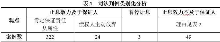 笔者一共收集到2014年至今共398个相关案例,其中支持停止计息效力及于保证人的判决有346例之多,除去原告主动变更诉讼请求放弃该利息的24例,法院裁判停止计息效力及于保证人的案例仍有322例;作出相反裁判的案例仅为49例;另有3例法院认为应当对保证人暂停计息,待主债务人破产程序终结后,再计算债务人破产受理之日起至债务实际清偿之日止的利息,该部分利息由保证人承担保证责任。详情如下表1所示。