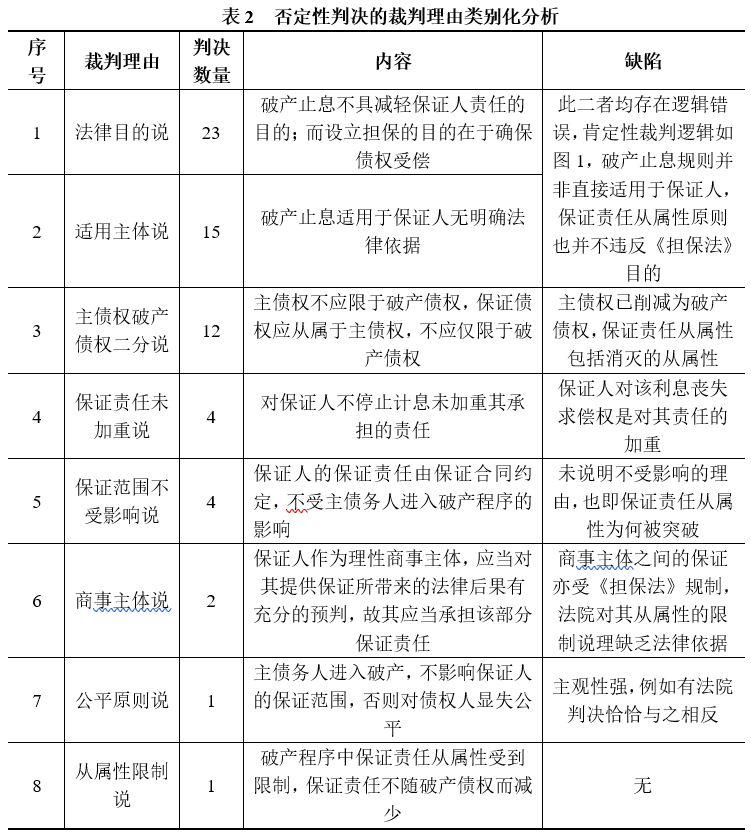 虽然前述否定性判决的说理多有不足之处(见表2),但都体现了法律实质公平的价值取向。在认识到债务人破产实际上是保证人应当担保的风险之一的基础上,法院判决保证人对该利息承担保证责任是债权人设立保证担保的应有之义。四川高院进而将该风险界定为“商业风险”,是法律解释和适用的更大进步。在我国民商事领域广泛使用的《担保法》及其司法解释并未区分民事担保和商事担保,更未提及商事担保具有的“商业风险”,使两高院的参考意见没有坚实的法律规范支持,是为立法疏漏之二。