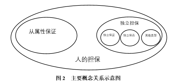 “独立担保”产生于20世纪50年代以后的商业实践,在不同法域中有不同的表现形式,例如履约保函、见索即付保函、银行保函等。《独立保函司法解释》第一条规定,独立保函是指银行或非银行金融机构作为开立人,以书面形式向受益人出具的,同意在受益人请求付款并提交符合保函要求的单据时,向其支付特定款项或在保函最高金额内付款的承诺。两相比较,“独立担保”是上位概念,“独立保函”是“独立担保”的一种形式。“独立担保”本质上仍是人保,严格来讲应当叫作“独立保证”,但是,“独立担保”不仅包括保证,还包括其他衍生类型,例如见索即付等,二者不可混淆。本文所称“独立保证”是“独立担保”的下位概念。所以,纵向来看,“独立担保”之下包括“独立保函”、“独立保证”以及其他衍生类型;横向来看,从属性保证与“独立担保”相对应,二者的区别在于是否严格遵从保证合同从属性原则。这些概念之间的关系如图2所示。