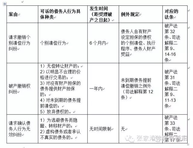 破产撤销权纠纷案件中包括的可诉的债务人行为,根据《企业破产法》第31条至第33条的规定及破产法司法解释二的补充规定,可分为三类,对应“最高人民法院关于印发修改后的《民事案件案由规定》的通知”中“与破产有关的纠纷”项下的三类子案由,具体见下表: