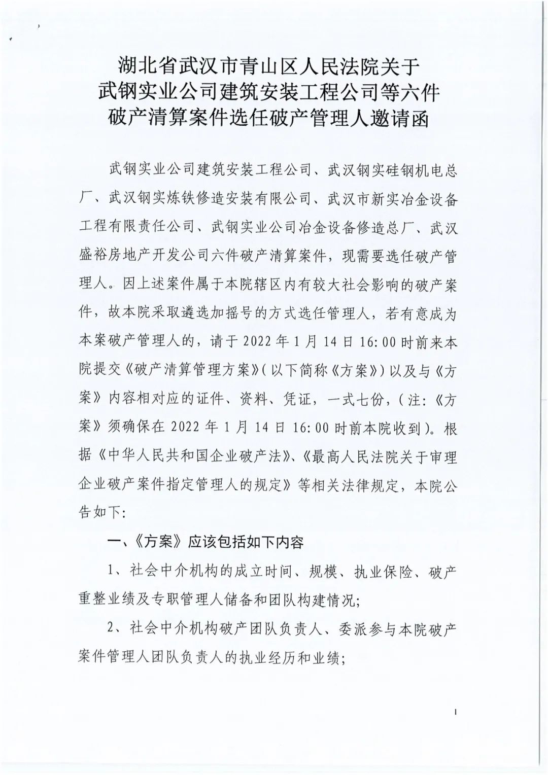 公告 | 武钢实业公司建筑安装工程公司等六件破产清算案件选任破产管理人