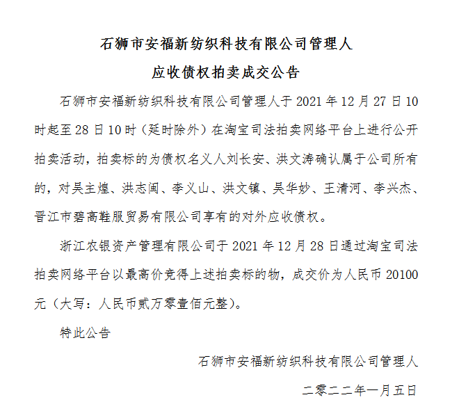 石狮市安福新纺织科技有限公司管理人应收债权拍卖成交公告