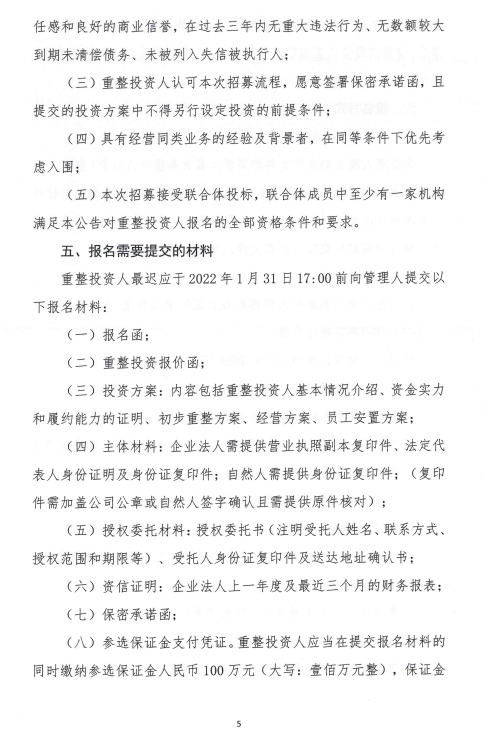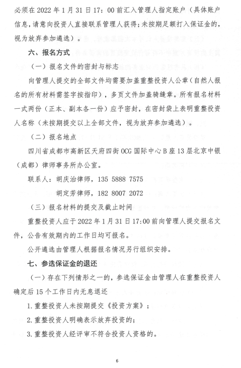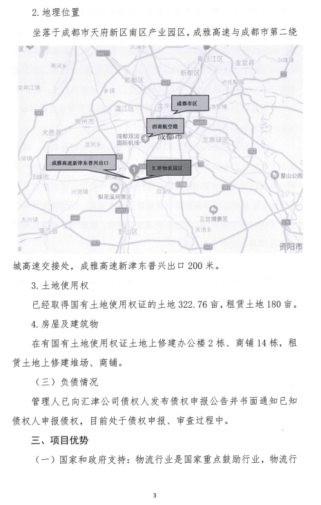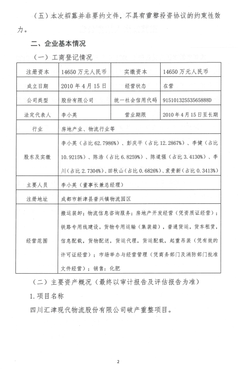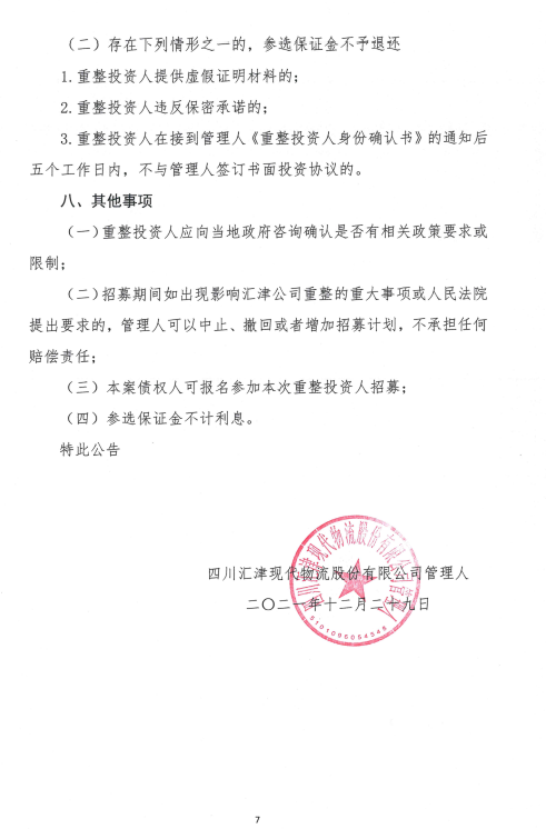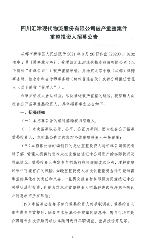 四川汇津现代物流股份有限公司重整投资人招募公告
