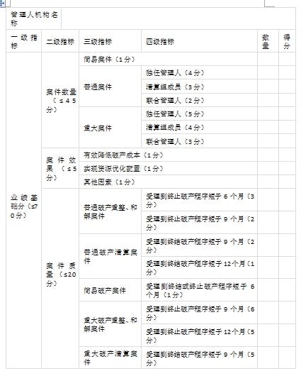 对参与竞争的管理人机构业绩的评定实行固定破产团队业绩评分制,最高分不超过100分,按得分高低进行排名。具体评分标准如下:
