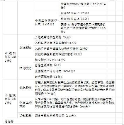 4.近三年内管理人个案工作情况评价表获评95分以上的案件,每件加2分,90分以上的,每件加1分,90分以下但管理人个案工作情况评价表中财产追收指标得分为满分的,每件加0.5分。该项得分累计不超过10分;