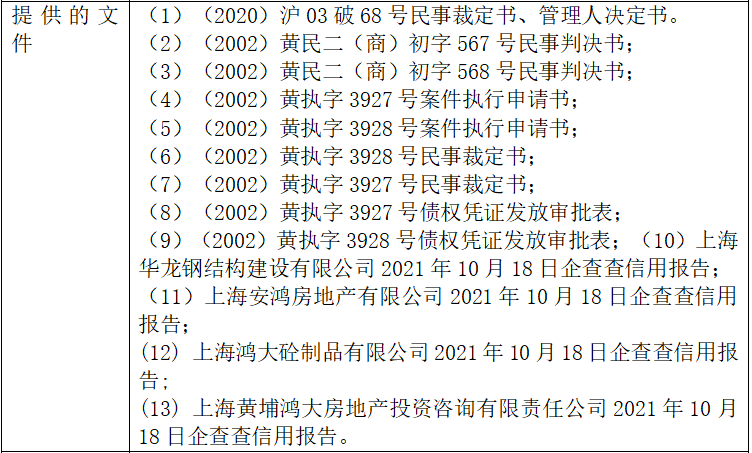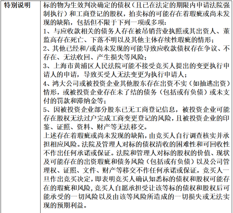 7、管理人未接管到4家对外投资企业的任何资料,4家企业已被吊销营业执照多年,且部分股东已无工商登记信息,虽然2021年10月18日企查查信用报告显示上海华龙钢结构建设有限公司、上海安鸿房地产有限公司、上海鸿大砼制品有限公司、上海黄埔鸿大房地产投资咨询有限责任公司自身无诉讼和行政处罚信息,但不排除因为信息公示和收集原因导致信用报告与客观事实不一致的情形。本次拍卖4家对外投资的股权成交后如鸿大公司存在任何出资不实的情形或者被投资企业存在任何债务和风险,管理人不承担任何责任,竞买人根据自身需求可自行调查、了解、核实,自行承担投资风险。竞买人可在股权过户后自行决定是否向人民法院撤回强制清算申请。