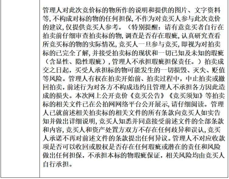 5、本次拍卖标的情况较为复杂,标的物以其现状为准,法院、管理人、拍卖机构不承担资产的瑕疵保证责任。除拍卖文件披露外,竞买人应对拍卖标的的实际状况以及瑕疵(含显性、隐性瑕疵)等自行调查核实、承担投资风险。