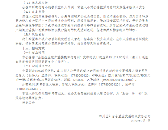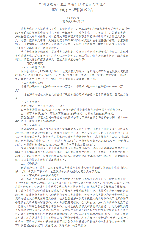 四川世纪百合置业发展有限责任公司管理人破产程序司法招商公告