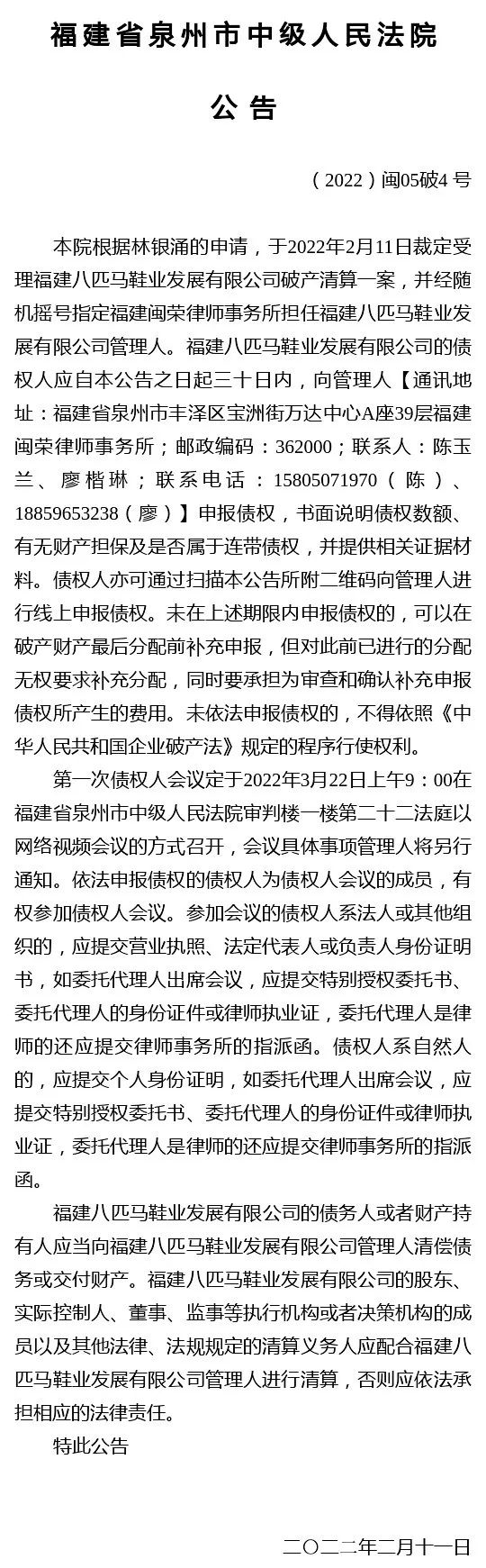 福建八匹马鞋业发展有限公司破产清算案裁定受理公告