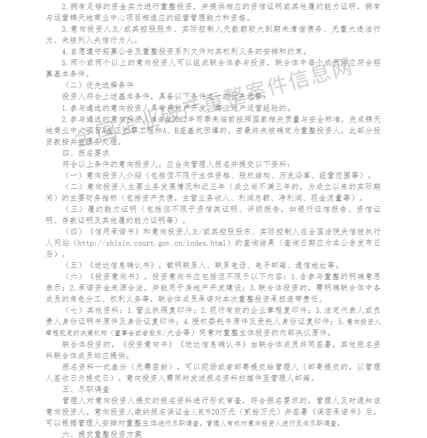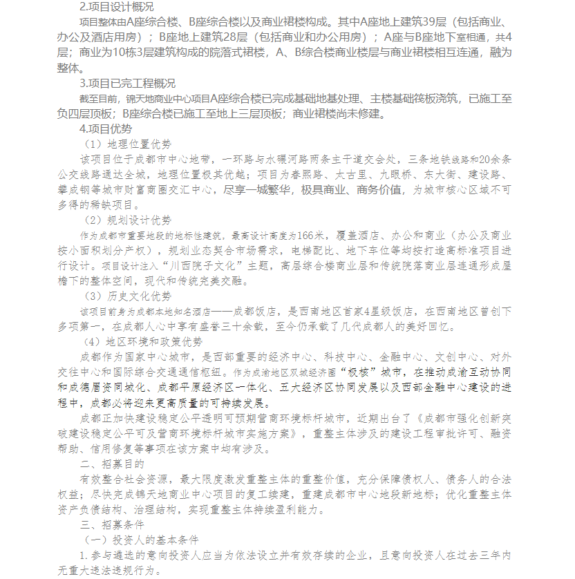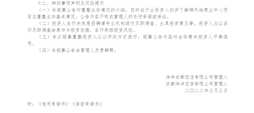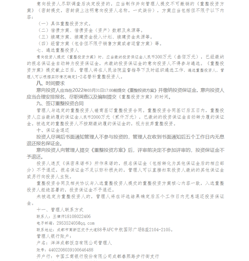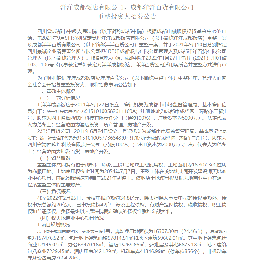 洋洋成都饭店有限公司、成都洋洋百货有限公司重整投资人招募公告