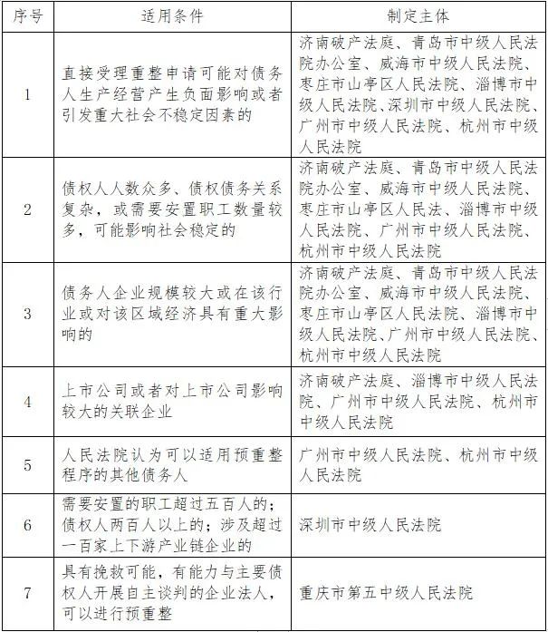 济南:债权人人数众多、债权债务关系复杂,或需要安置职工数量较多,可能影响社会稳定的;债务人企业规模较大或在该行业或对该区域经济具有重大影响的;上市公司或者对上市公司影响较大的关联企业;直接受理重整申请可能对债务人生产经营产生负面影响或者引发重大社会不稳定因素的。