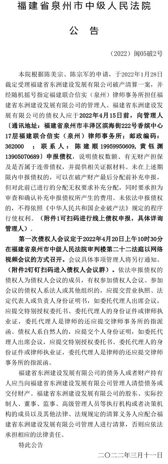福建省东洲建设发展有限公司破产清算案裁定受理公告