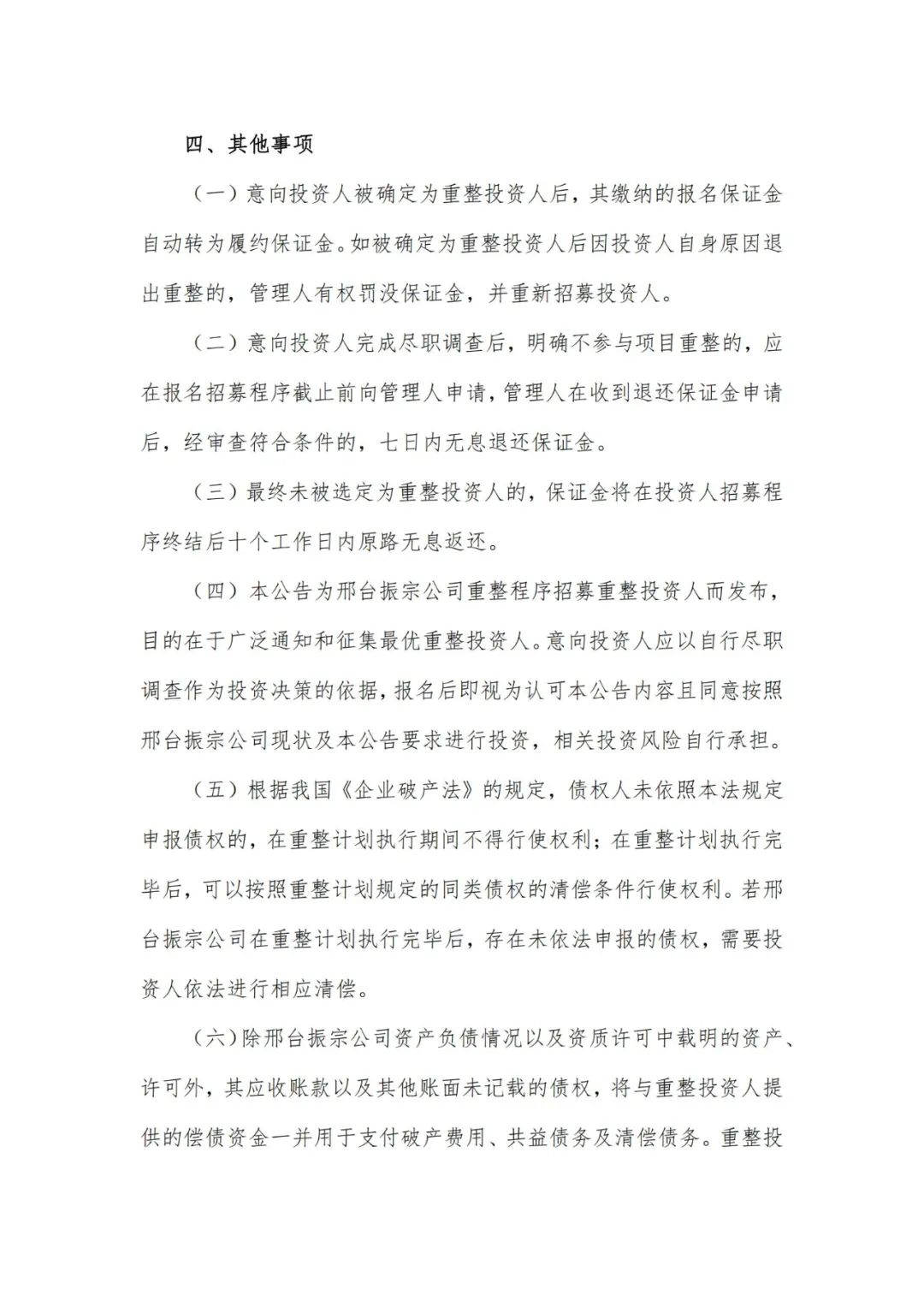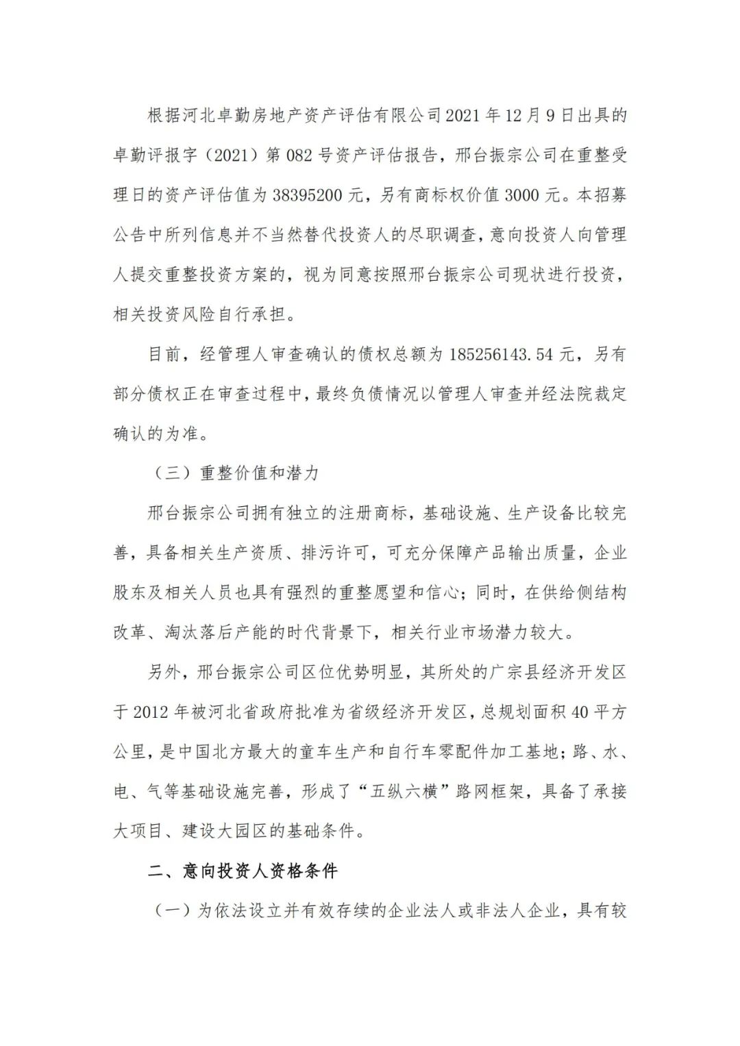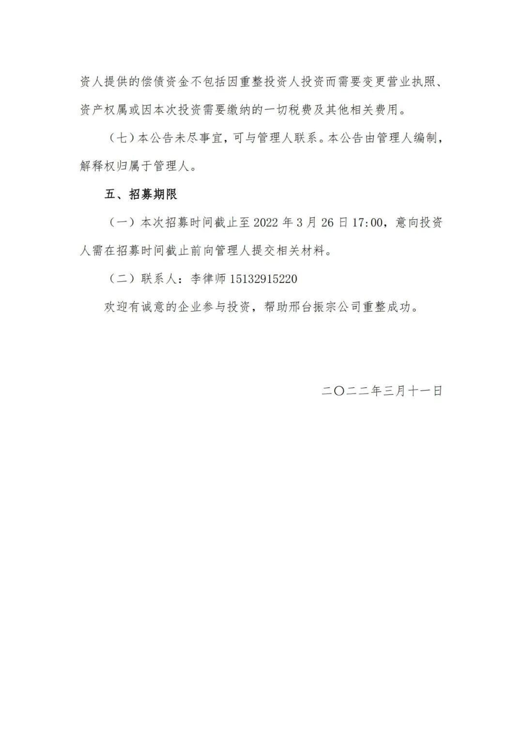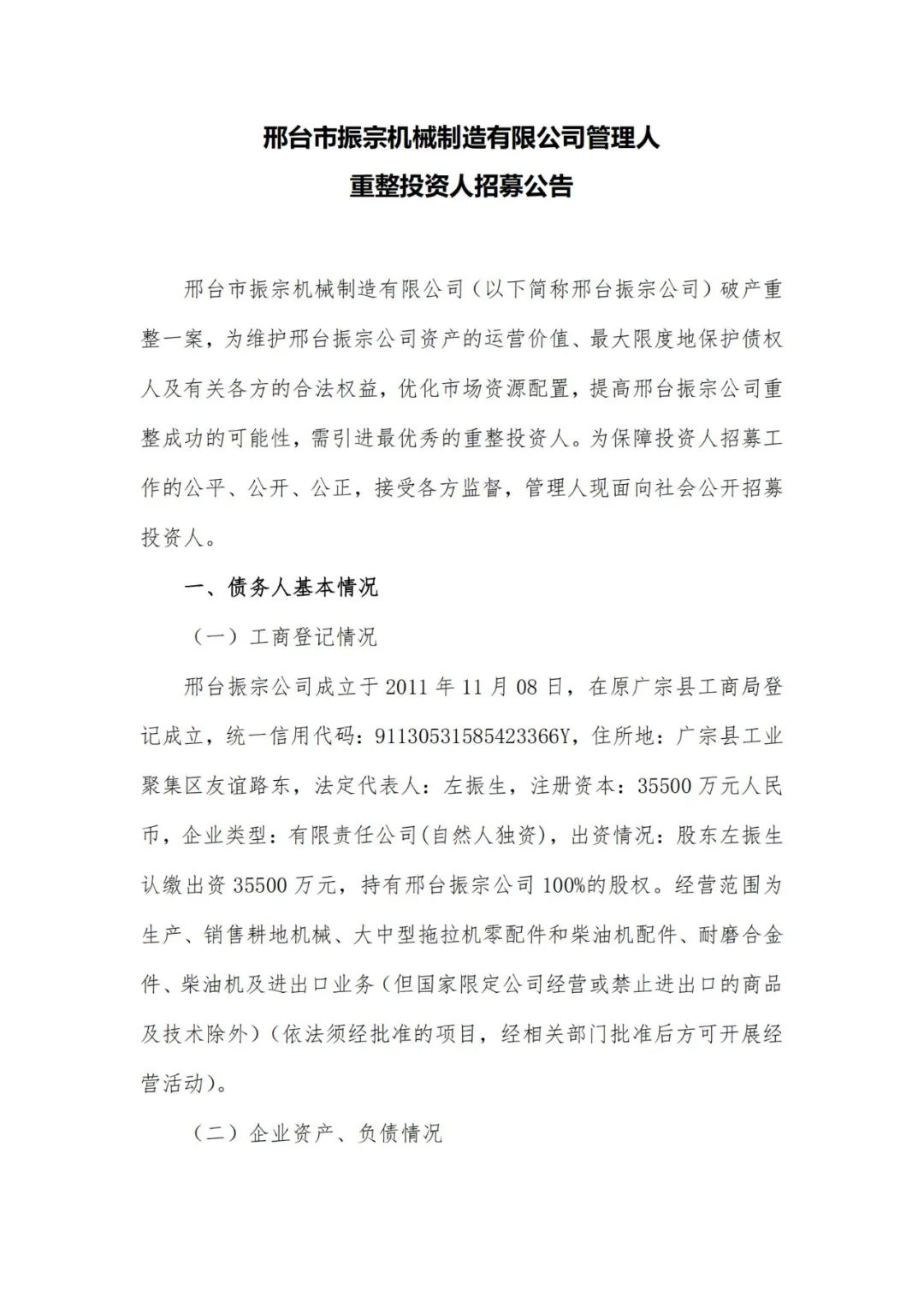邢台市振宗机械制造有限公司管理人重整投资人招募公告