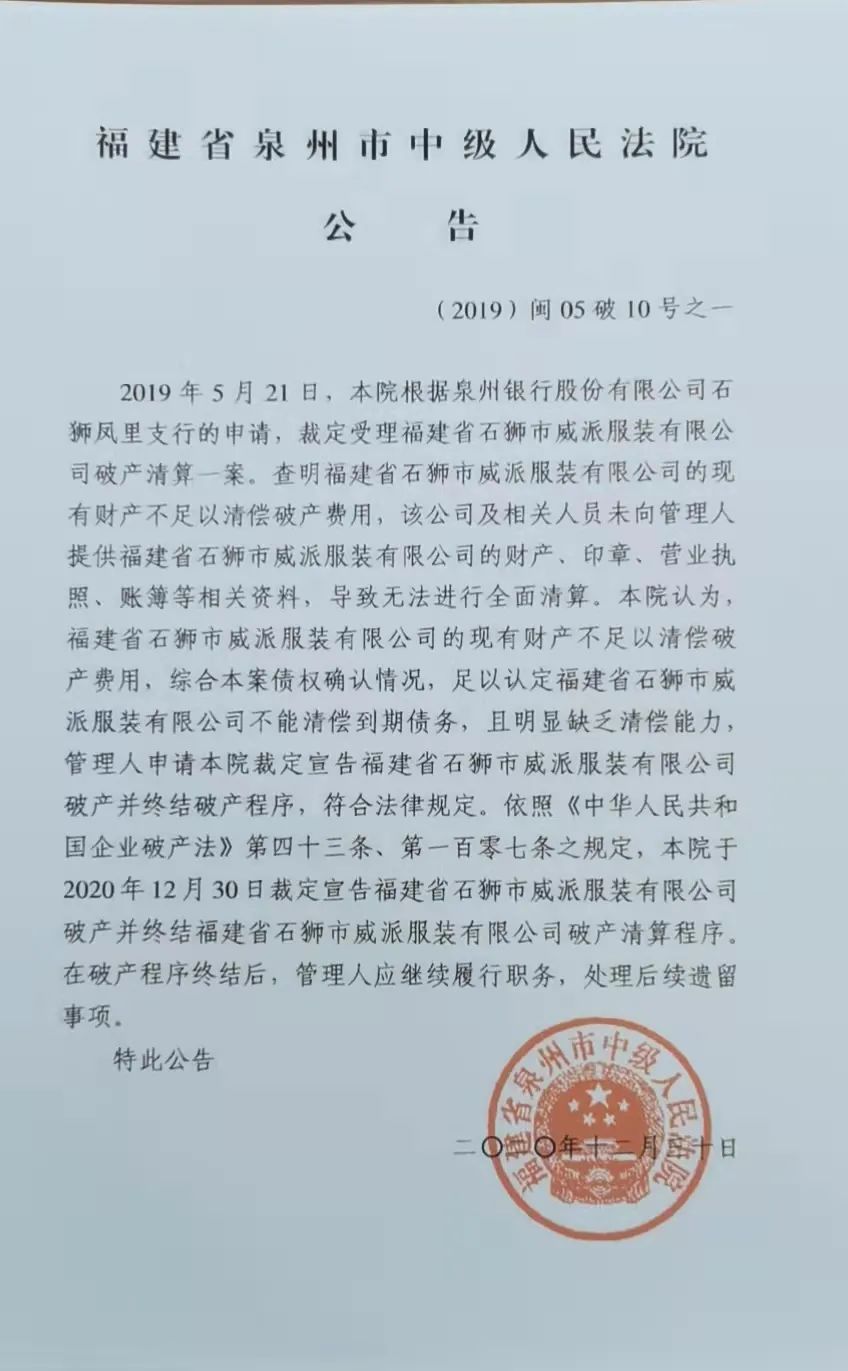 宣告福建省石狮市威派服装有限公司破产并终结破产清算程序