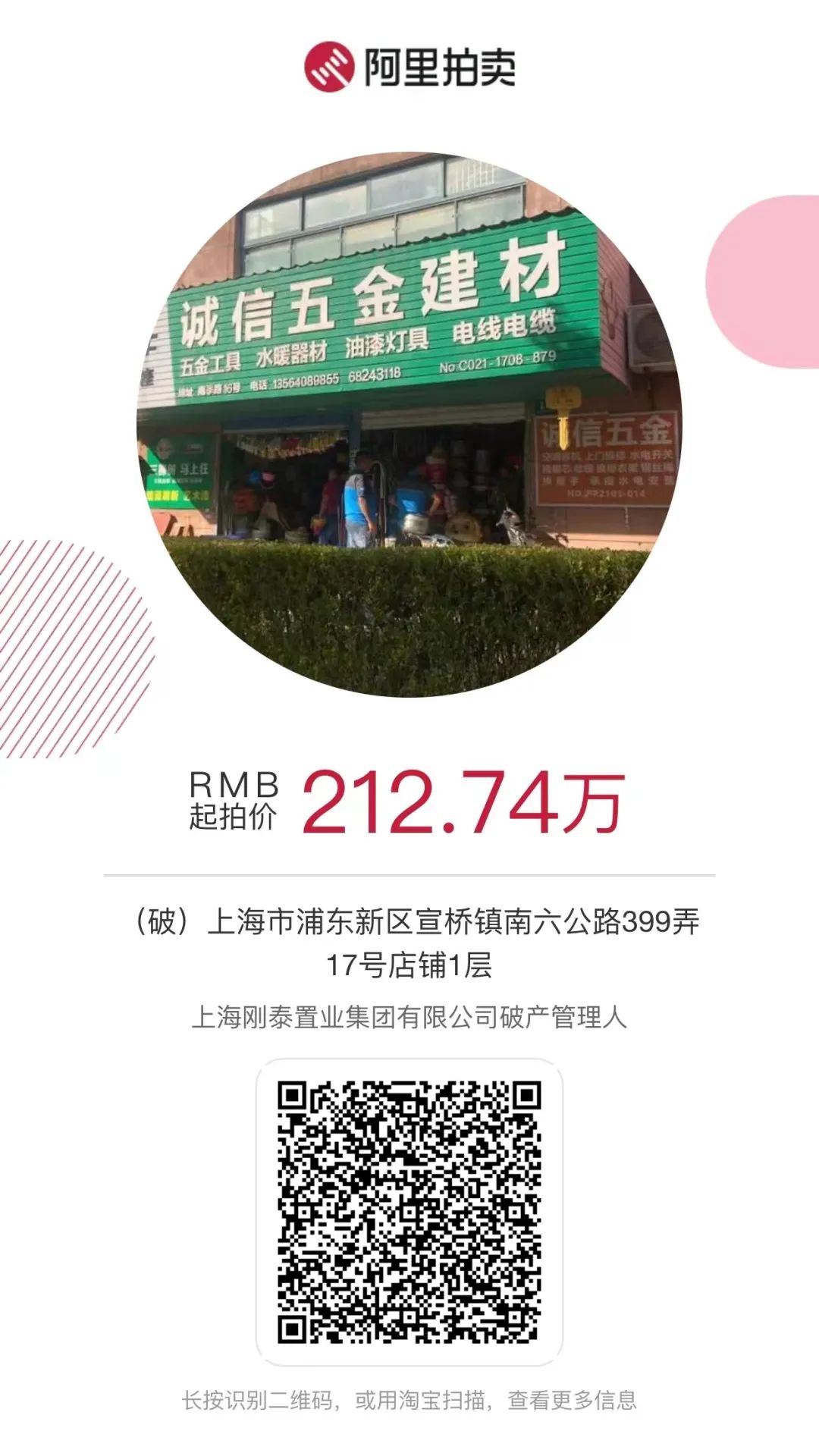 12、【一拍评估价】上海申杰塑料建材有限公司破产财产:上海市松江区泖港镇新波路517弄11号工业房地产,建筑物面积:1547.08㎡。土地使用权面积2558.50㎡。3月22日开拍。