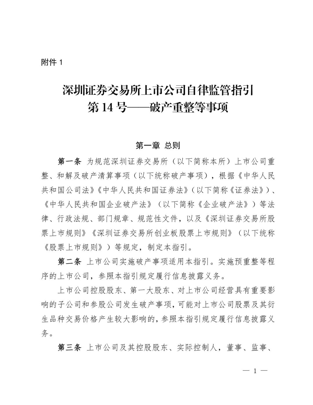 附件 1 :深圳证券交易所上市公司自律监管指引第14号——破产重整等事项