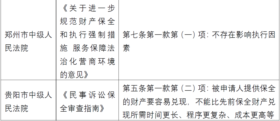 担保财产的可执行性审查源于避免被保全人使用难以兑现的财产以解除保全,从而侵害申请保全人合法权益,平衡双方利益之需。但在审查标准上《民诉法解释》第一百六十七条仅提出了“有利于执行”这一宽泛概念,而在《保全规定》第二十二条中更是仅落得“有效”二字,参考性十分有限。因此,下文仍将通过各地法院的司法实践及其经验总结,对可执行性的影响因素进行一定的归纳。