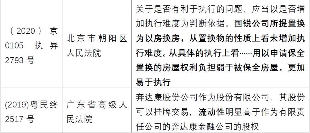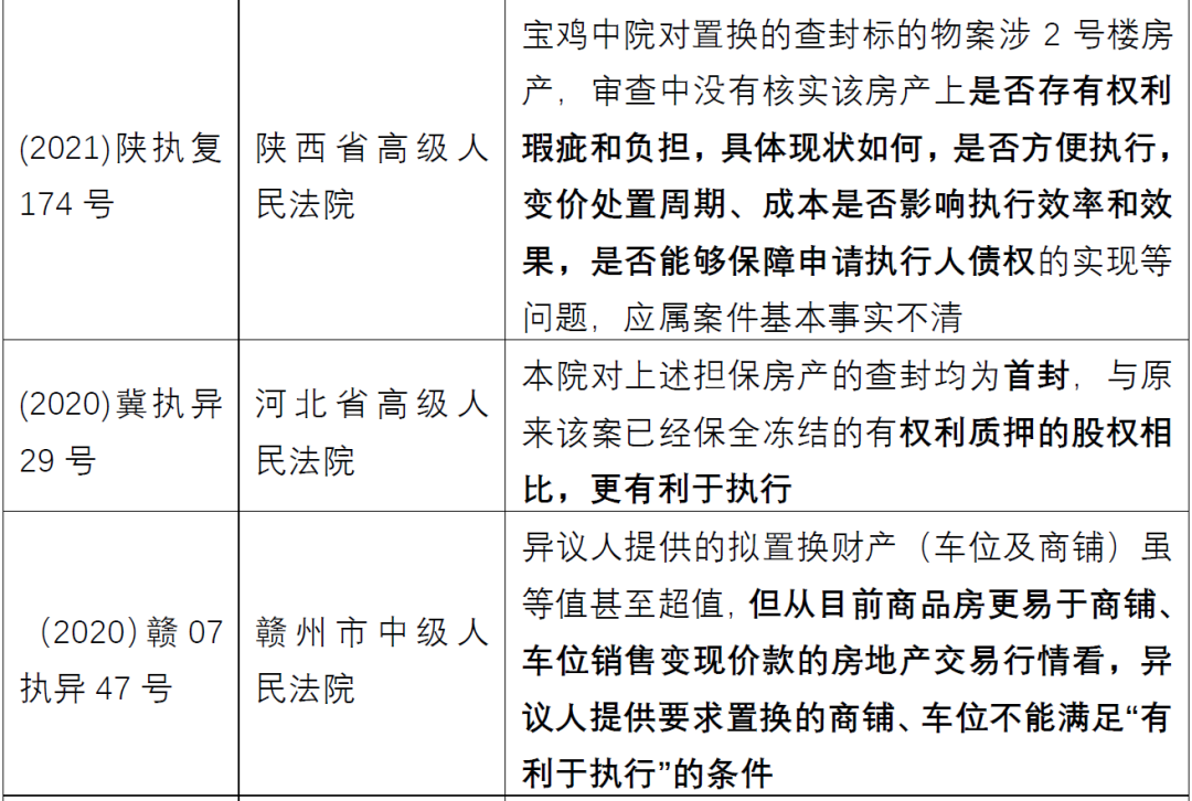 综合前述案例来看,从担保财产的财产属性出发,权利瑕疵、权利负担、财产现状、财产流通性等不仅是判断担保财产价值的考量因素,也是判断是否“有利于执行”的重要指标。此外,从处置方面来看,执行周期、执行措施、执行效率、执行难易程度、是否为首封等也是执行性审查中的重要考察因素。