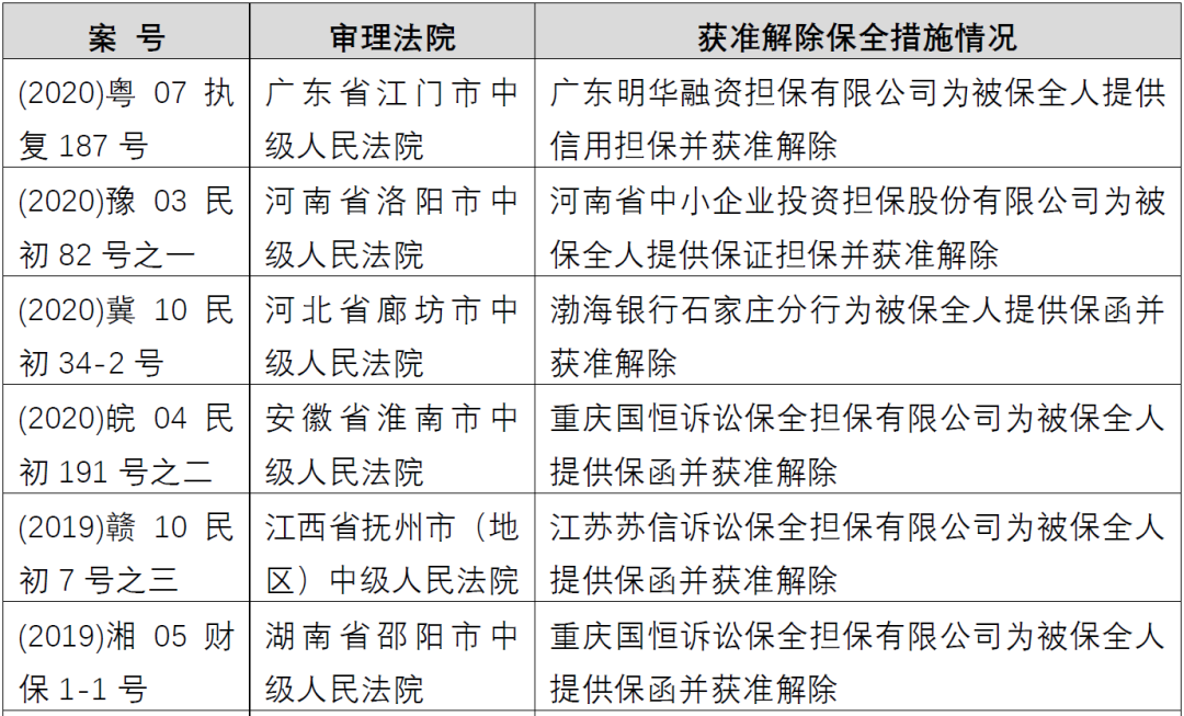 此外,在如下案件中被保全人均仅通过提供保证担保就解除了保全措施: