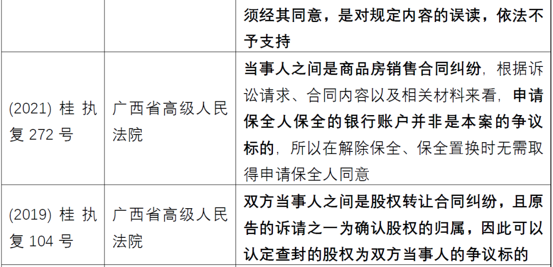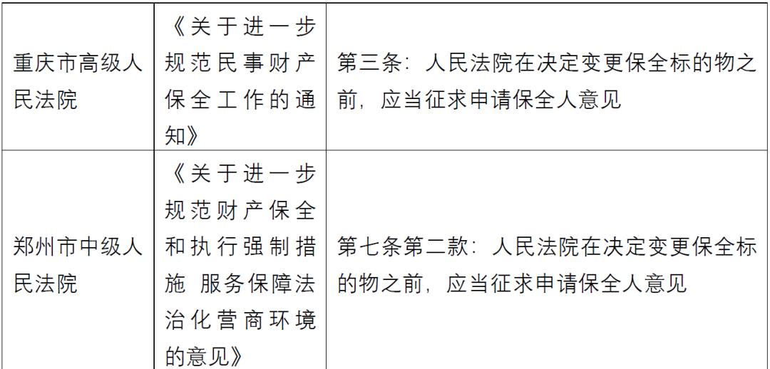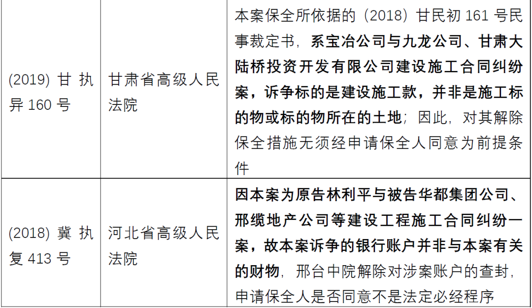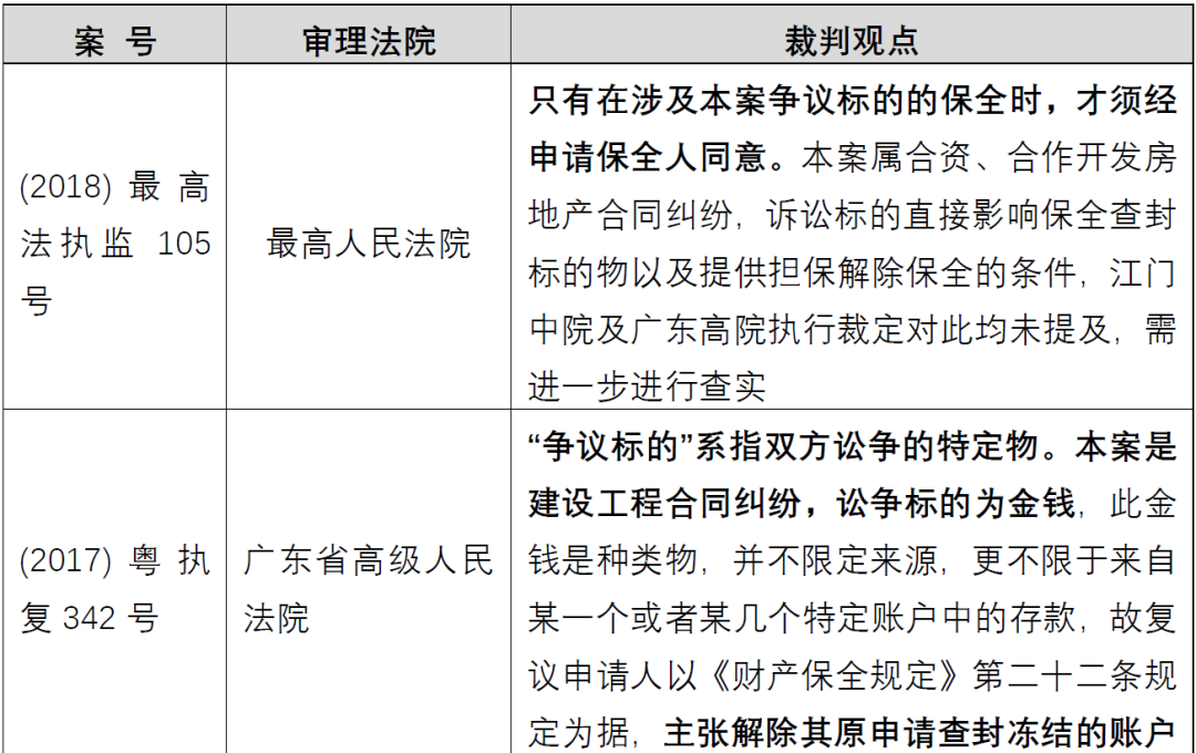 现行规定中对于解除保全须经申请保全人同意的规定仅见于《保全规定》第二十二条后段,且仅在解除作为争议标的的财产保全措施时才适用。而除此之外解除保全不再以申请保全人同意为必要,最高院对此亦持相同态度[8]。然而,在《关于人民法院民事执行中查封、扣押、冻结财产的规定》的长期影响下,目前仍有部分法院对此不能达成共识。