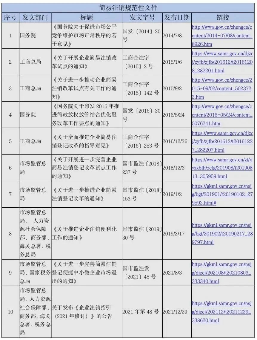 以此为背景,国家推出简易注销制度。伴随着相关部门相继出台以下文件,简易注销制度不断完善:
