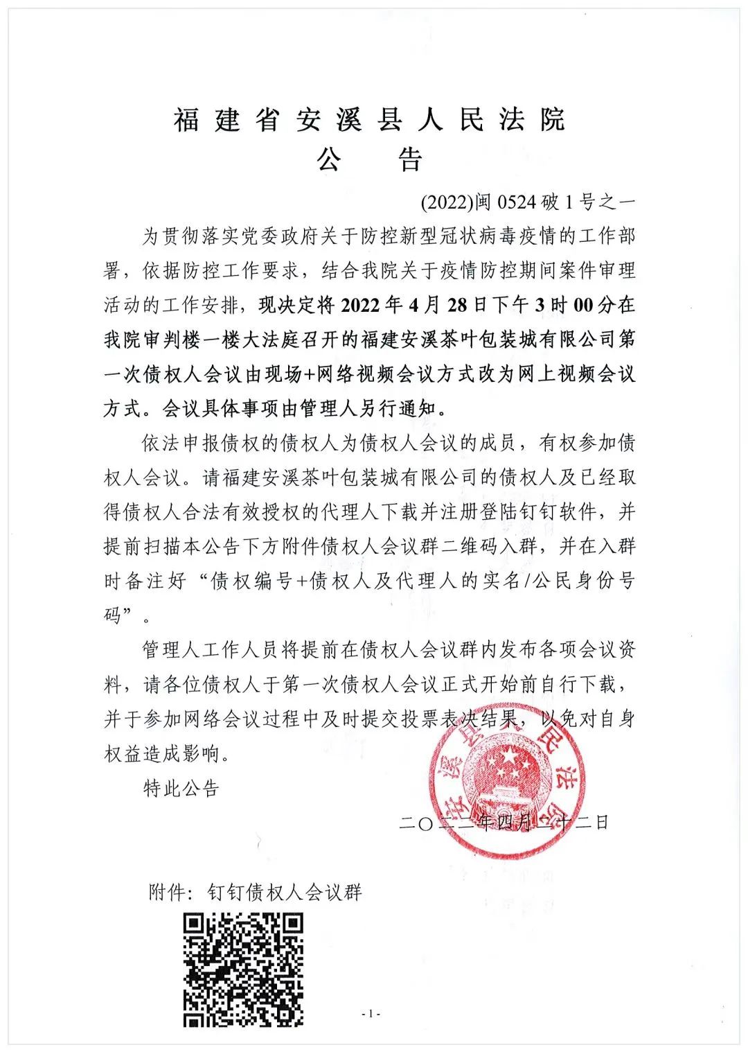 关于福建安溪茶叶包装城有限公司第一次债权人会议召开方式的公告