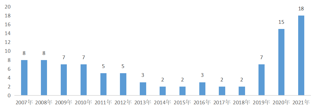 2007-2021年全国法院受理上市公司破产整理案件数量