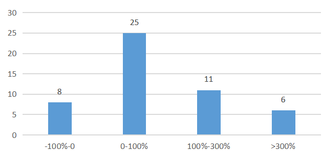 据统计,包括鼎一投资《透视破产重整背后的数字密码》、黄亮平等《2021年度中国上市公司破产重整情况研究》(数据经作者整理更新),自2007年6月《企业破产法》实施以来,至2021年末,全国法院正式受理的上市公司破产重整共有94家,总体呈现:一是近年受理数量大幅上升,2014年至2018年,上市公司破产重整受理数量每年仅2家左右,2019年至2021年,分别达到7家、15家、18家,合计占比43%;二是区域分布集中,华东、华南分别有20家、19家,合计占总数41%;三是重整方式呈现多样化、综合化,绝大多数公司综合采用债转股、留债展期、以资抵债等清偿方式相结合;四是重整后公司市值得到不同程度修复。在重整计划执行完毕后一年,50家公司中超过84%的公司市值上升,其中有11家市值涨幅为100%-300%,有6家市值涨幅超过300%。