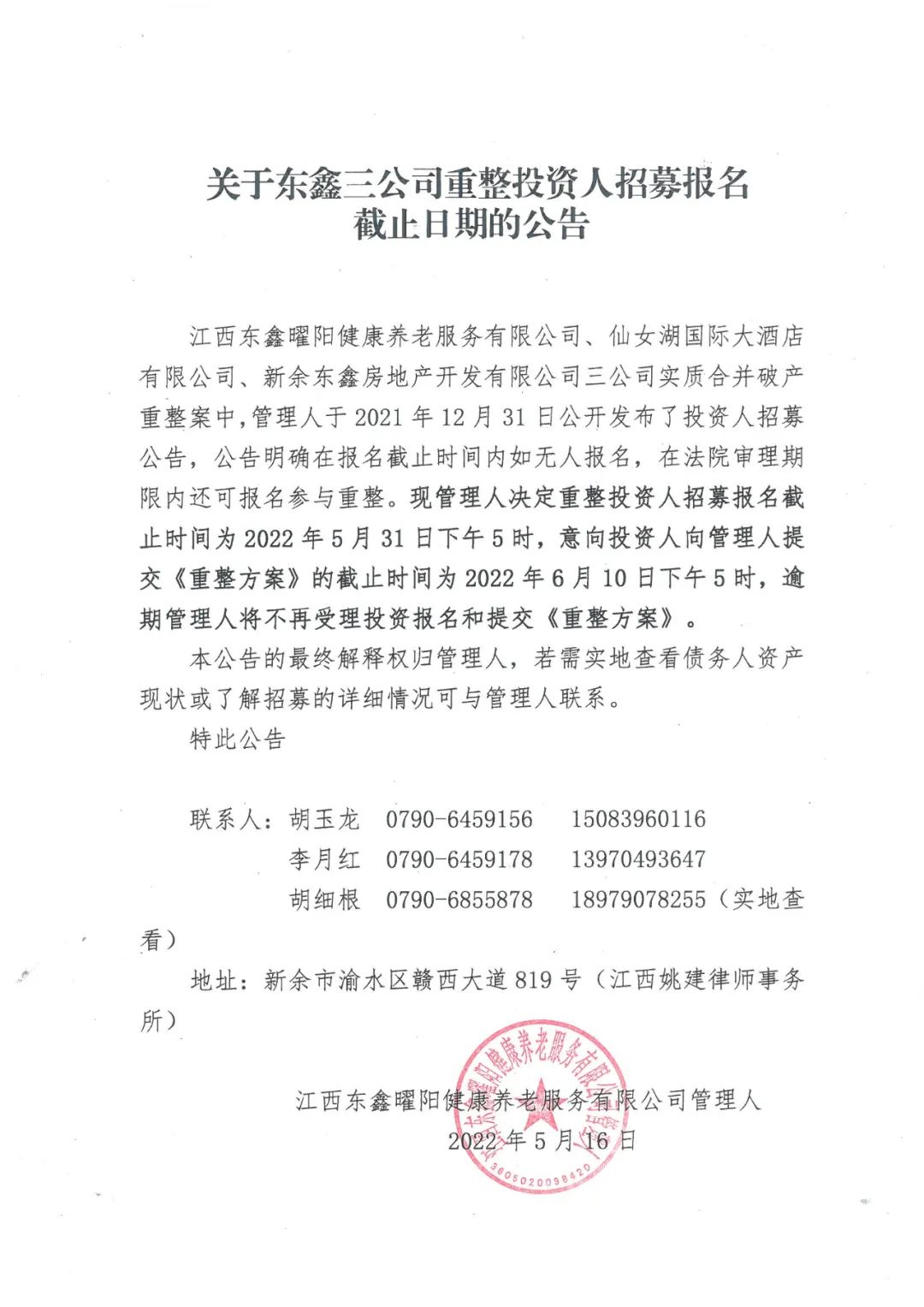 关于东鑫三公司重整投资人招募报名截止日期的公告
