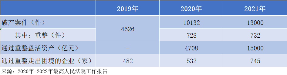 根据最高人民法院工作报告,近年来全国法院审结的破产重整案件数量明显提升,2021年通过重整盘活的资产规模高达1.5万亿,同比增长218%,通过重整走出困境的企业745家,同比增长40%。