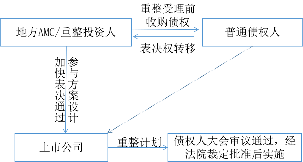 破产债权收购模式一般是指地方AMC通过公开竞标或者协议收购的方式,以相对于账面原值一定比例的折扣收购破产债权,获得债权管理主动权和处置价格优势,加快推动实现破产重整的方式盘活债务,提升资产的长期价值,实现最大程度的债权利益。地方AMC通过提前研判公司重整价值及升值空间,在重整计划实施前,主动收购公司的债权成为重要债权人,参与其重整计划的设计与表决,推进重整计划落地。如长城资产在*ST超日破产重整项目中,直接收购*ST超日7.47亿元非金融债权,加快推动重整计划以69.89%比例获得债权人大会审议通过,为*ST超日重整成功奠定基础。