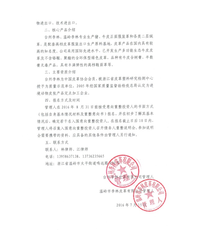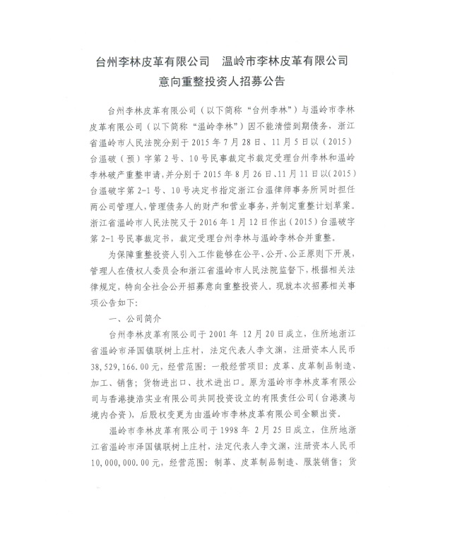 台州李林皮革有限公司 温岭市李林皮革有限公司意向重整投资人招募公告