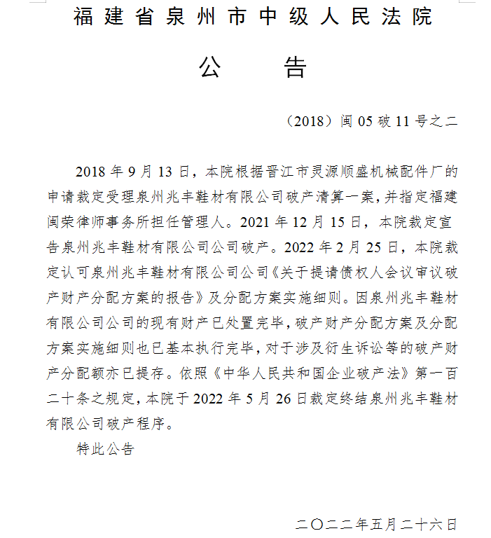 裁定终结泉州兆丰鞋材有限公司破产程序