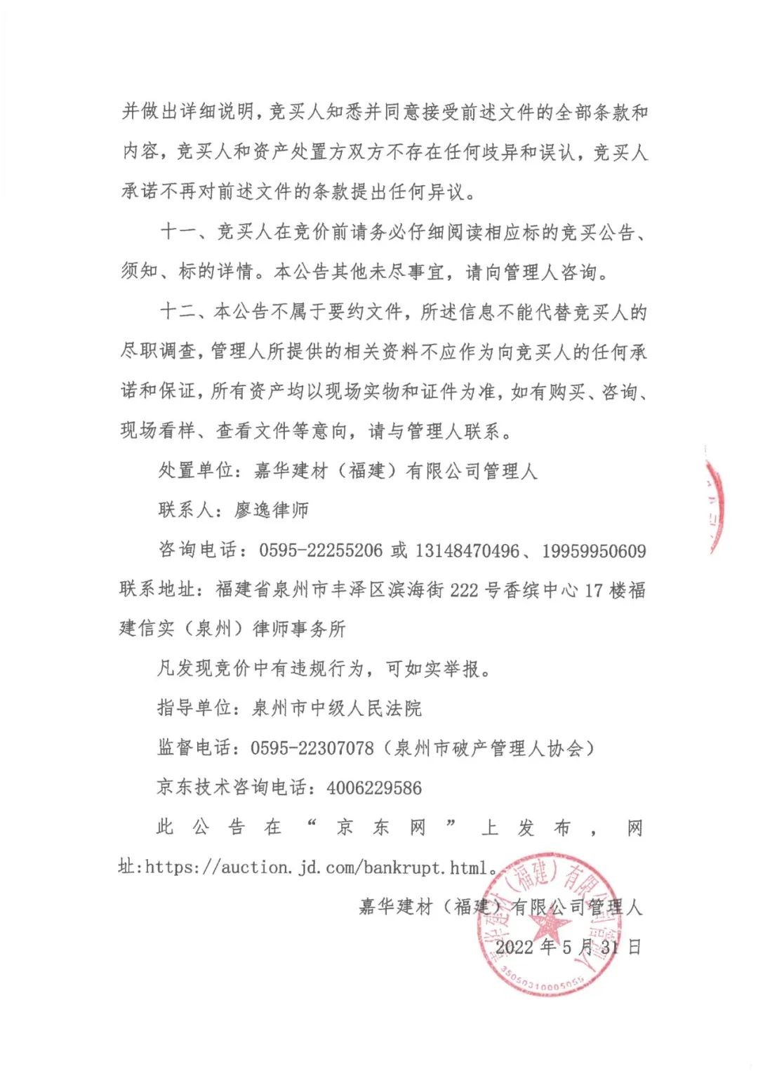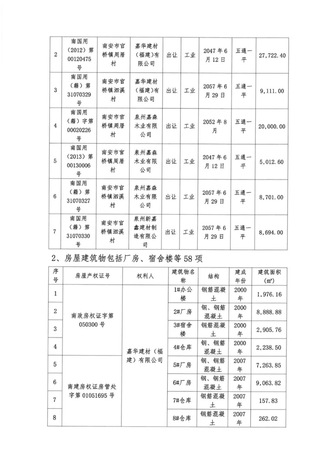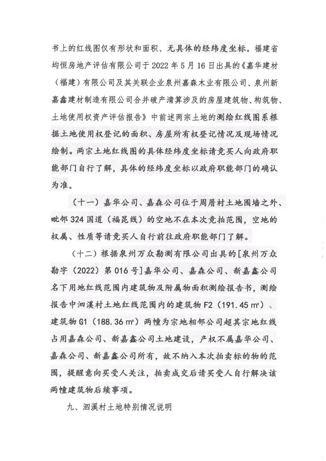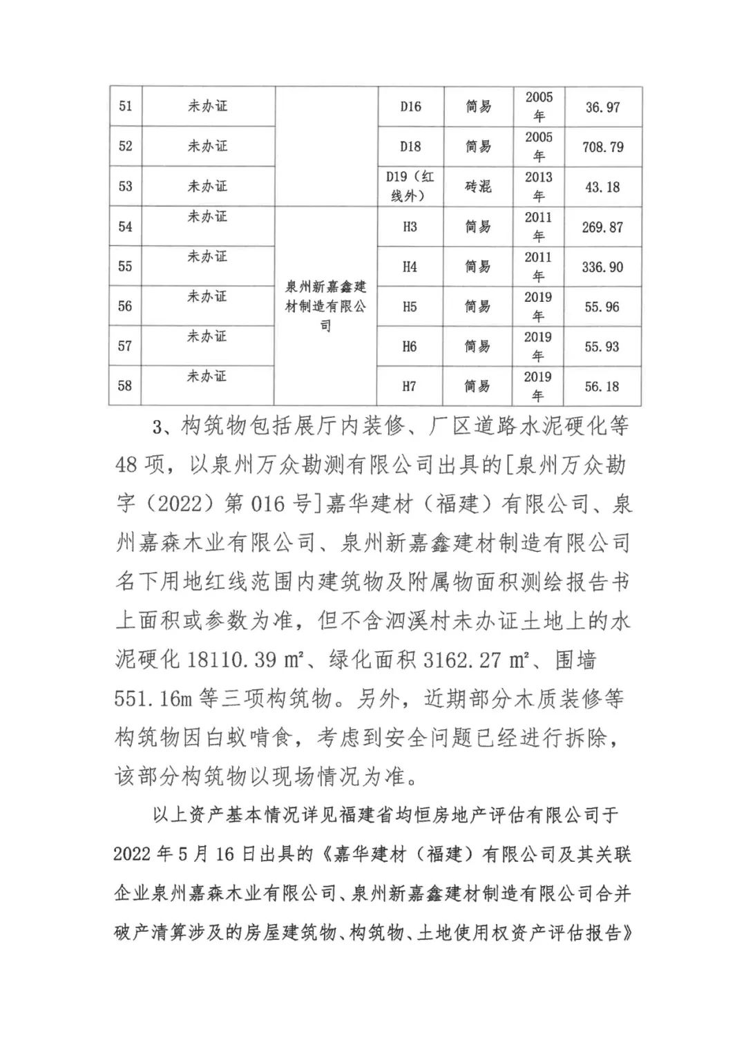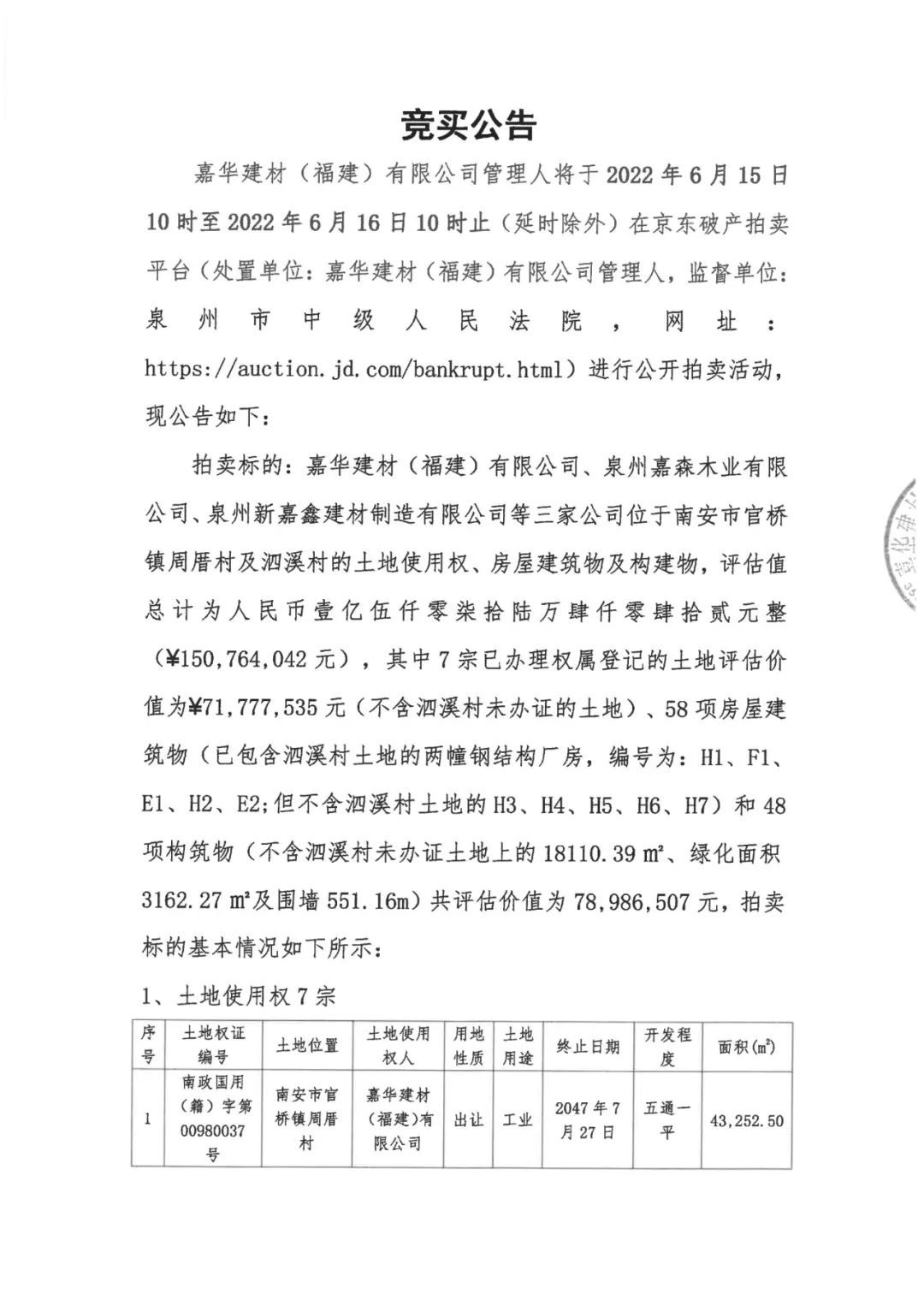 嘉华建材、嘉森木业、新嘉鑫建材等三家公司位于南安市官桥镇周厝村及泗溪村的土地使用权、房屋建筑物及构建物竞买公告