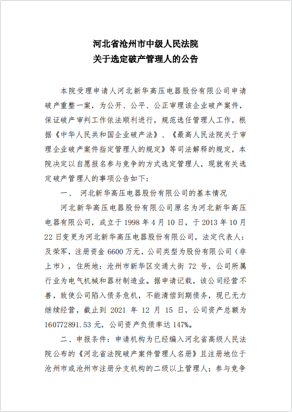 关于河北新华高压电器股份有限公司破产重整一案选定管理人的公告