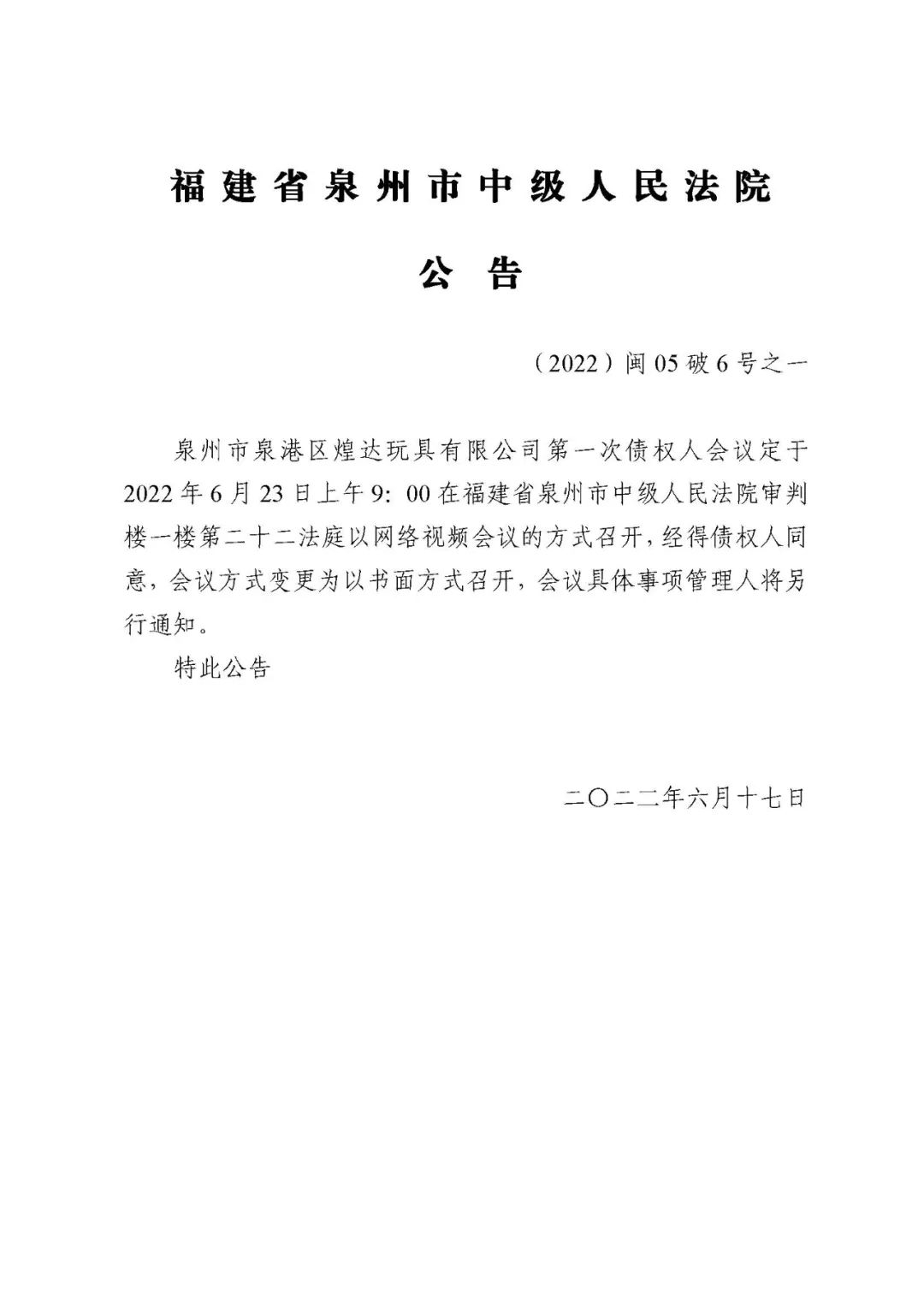 泉州市泉港区煌达玩具有限公司破产清算案第一次债权人会议变更召开方式公告