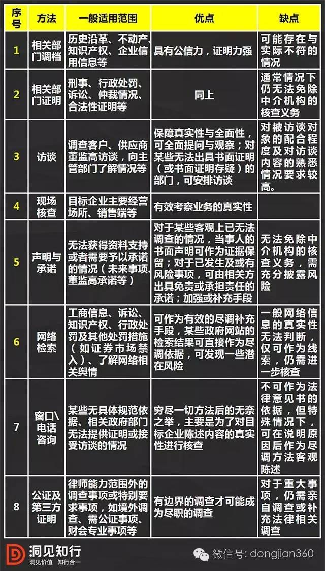 就此,本文总结了几种常用的尽调方法(不包括目标企业提供基础资料),并对其适用范围,优劣等予以比较。其中,1-6项在并购项目中都会涉及,7-8项不常用。