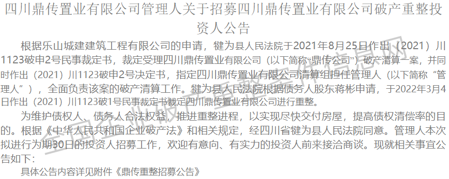 四川鼎传置业有限公司管理人关于招募四川鼎传置业有限公司破产重整投资人公告