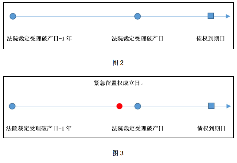 在法院受理破产案件的情形中,与普通留置权的成立相比较,紧急留置权的成立时点较为特殊。在图1中,债权到期日就是留置权成立的时点。但在图2中,将债权到期日便不适宜作为紧急留置权的成立时点,因为一旦进入破产程序,未到期的债权会在破产受理日加速到期。此外,如将债权到期日设定为紧急留置权的成立时点,也将无法体现出紧急留置权应对债务人丧失清偿能力时的特殊效用。那么,法院裁定受理破产日能否被认定为紧急留置权的成立的时点?笔者认为,将法院裁定受理日作为紧急留置权的成立时点,仍缺乏法律上的严谨性。因为,法院从审核破产申请到最终出具受理破产案件的裁定之间,有一段时间差。如法院最终裁定受理破产申请,说明在裁定做出前,债务人便已出现了丧失清偿能力的事实。即使在执转破的案件中,无财产可供执行的情况在破产受理裁定做出之前也已出现。故而,在法院裁定受理破产案件的情形中,紧急留置权的成立时点仍应落入到破产受理前一年内的期间中。对于紧急留置权的成立,各时间节点如图3所示(红色圆点代表紧急留置权的成立时点):