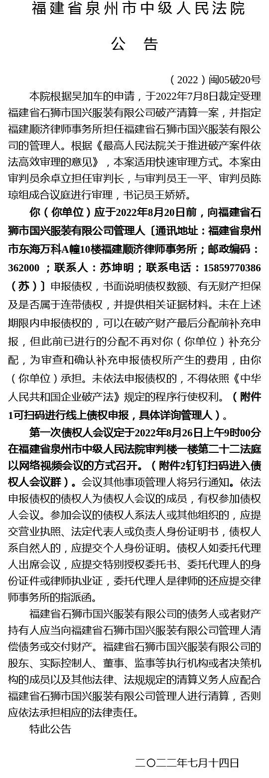 福建省石狮市国兴服装有限公司破产清算一案裁定受理公告