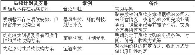 由于未来收购的不确定性,目前明确收购方式的案例较少,例如,掌趣科技明确约定了以发行股份的方式收购标的公司剩余股份,宝通股份约定可以采取现金或者现金结合股份方式。
