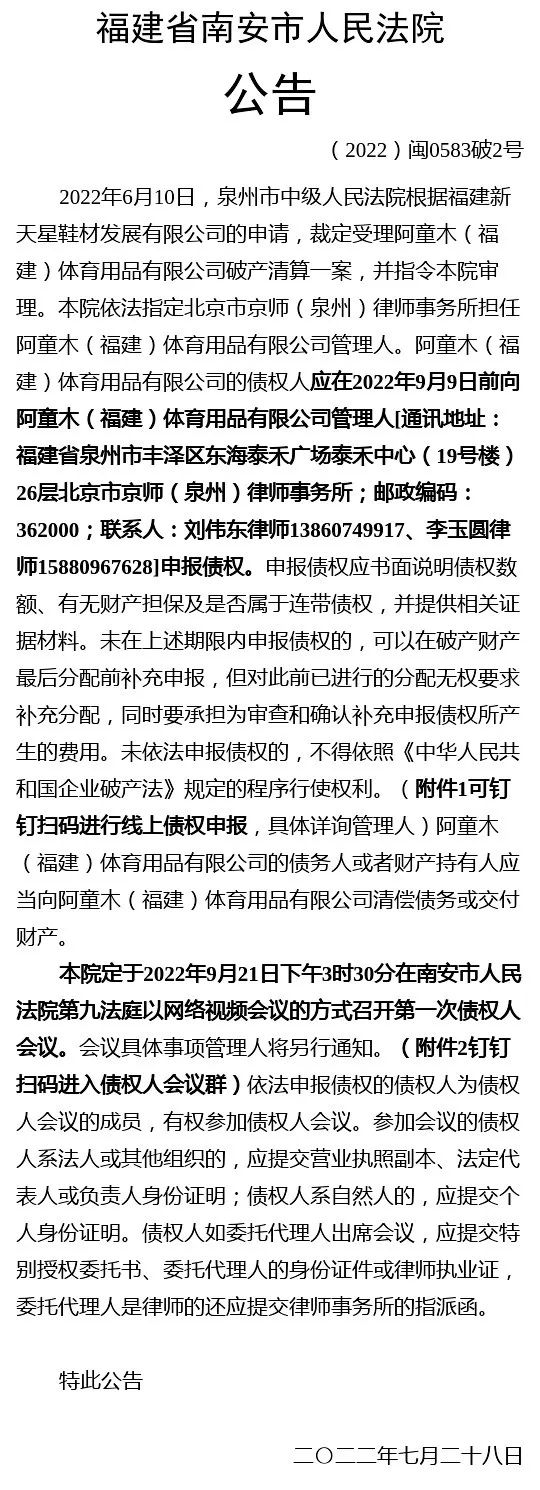 阿童木(福建)体育用品有限公司破产清算一案裁定受理公告