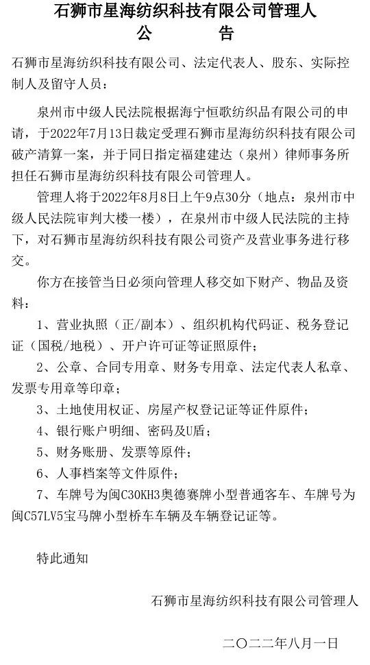 石狮市星海纺织科技有限公司管理人接管公告