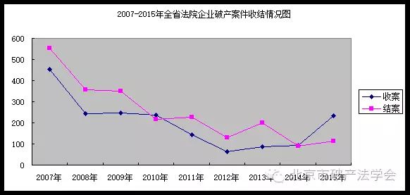1.破产案件数量总体呈下降趋势,但近年已有回升势头。2007年至2012年,山东法院受理破产案件数量不升反降,年均下降约10%,2012年仅受理63件,为历年最低,此前的2002年曾达到峰值为865件。2013年以后,破产案件收案数量逐年上升,2015年达到235件,同比增长150%。新企业破产法和公司法规定的清算制度,为市场主体退出提供了法律途径,但从山东全省范围看,多数企业没有清理债权债务就直接退出市场,进入破产程序的企业数量相对较少,新企业破产法的执行情况与立法预期尚有较大差距。