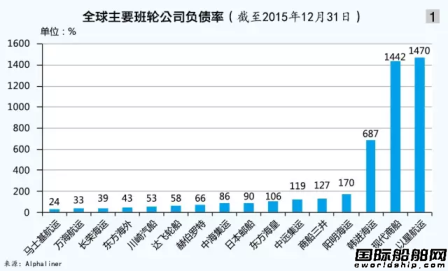 所以,负债率过高的班轮公司要采取切实行动,降低负债率。全球银行,尤其是原来有大量航运资产的欧美银行都在想方设法调低这一部分的比例。一旦这些银行决定抽贷,像韩进海运这类依靠银行资助的典型“僵尸企业”就不可避免地走向破产。根据Alphaliner截至去年年底的数据(见图1),就主要的班轮公司而言,状况最好的是马士基航运,其负债率最低,为24%;负债率超过100%的班轮公司有东方海皇、中远集运、商船三井、阳明海运、韩进海运、现代商船及以星航运。其中,此次宣布破产保护的韩进海运负债率为687%;现代商船及以星航运负债率更是分别高达1442%和1470%,都处于非常危险的状态。
