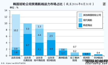 观察韩进海运的业务布局,会发现其集装箱业务主要聚焦在东西航线上的跨太平洋航线和亚欧航线,占比相当大。从Alphaliner的统计数据来看,截至8月底,韩进海运在远东至北美航线、远东至欧洲航线、远东至地中海航线上的市场占比分别为6.7%、4.9%、4.1%(见图2),可谓投入重金;而另一家韩国班轮公司现代商船在上述三条航线占比分别为3.3%、2.5%、4.4%.