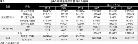 自2008年全球金融危机后,全球主要经济体经济和贸易增长趋缓,班轮行业整体受到冲击,其中受冲击最大的就有跨太平洋和亚欧两条航线。所以整体来看,韩进海运的集装箱业务受市场低迷影响严重(见表3),从2013-2015年的3年数据来看,几乎所有航线收入均连续下跌,唯一保持平稳的航线就是亚洲区域内航线,但这一航线占比有限。