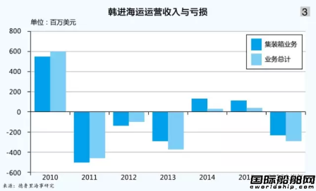 自2010年到今年上半年,韩进海运运营亏损近5.8亿美元,主要来自于集装箱运输板块(见图3)。